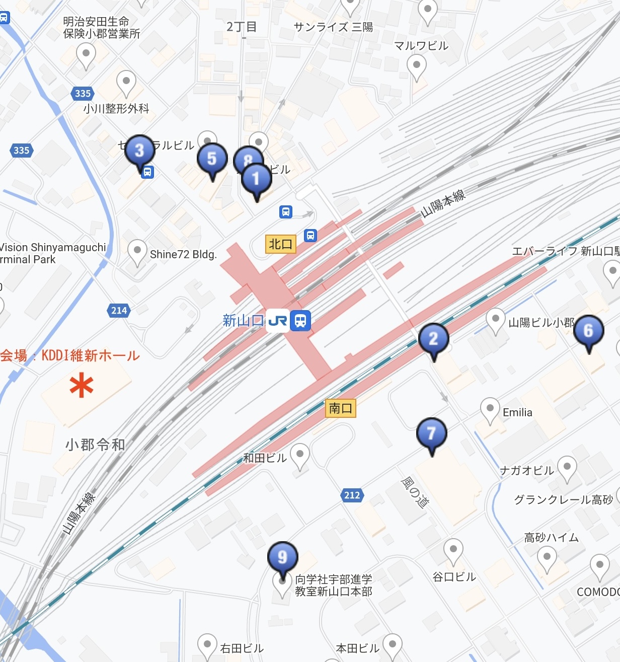 1.FAST HOTEL 2.ホテルアクティブ!山口 3.ホテルアルファーワン小郡 5.コンフォートホテル新山口 6.ホテル アムゼ新山口 7.山口グランドホテル 8.ロイヤルイン新山口駅前 9.東横INN新山口駅新幹線口 |