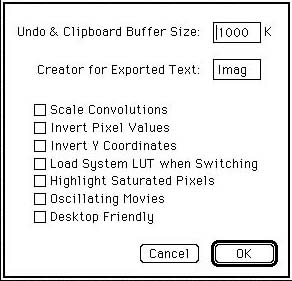 NIH Imageは,ダウンロードしたフォルダ内の顕微鏡のアイコンをダブルクリックすると起動します.メモリの割り当ては,なるべく多めにして下さい.初期設定は,OptionメニューからPreferencesを選び,Undo&Clipboard Buffer Sizeを1000Kにして,各チェックボックスをすべて解除して下さい(画像の左上が座標の原点になります).