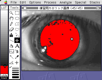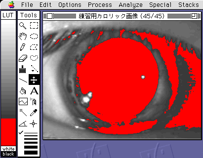 このマクロを選んで,瞳孔のみ赤色になるようにします.調整は,画面左端のLUTウインドウをマウスで上下に操作します.瞳孔の輪郭が明瞭に描き出される閾値で止めて下さい(LUTウインドウの下に閾値の数値が出ます.はじめはUpperが200になっています.練習画像ではUpperを224にして下さい).睫毛などで少し欠損ができるくらいに調整するのがコツです(欠損があっても自動的に穴埋め処理するから大丈夫です).