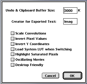 NIH Imageは,ダウンロードしたフォルダ内の顕微鏡のアイコンをダブルクリックすると起動します.メモリの割り当ては,なるべく多めにして下さい.初期設定は,OptionメニューからPreferencesを選び,Undo&Clipboard