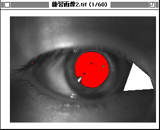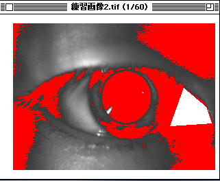 このマクロを選んで,瞳孔のみ赤色になるようにします.調整は,画面左端のLUTウインドウをマウスで上下に操作します.瞳孔の輪郭が明瞭に描き出される閾値で止めて下さい(LUTウインドウの下に閾値の数値が出ます.はじめはUpperが200になっています.練習画像ではUpperを224にして下さい).