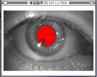 注意)必ず1コマ目の画像で虹彩紋理の範囲を指定して下さい。指定の方法は,下図のようにだ円ツールで虹彩紋理全体が入るようにだ円を描くだけです。2コマ目以降は必要ありません。