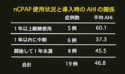 - 日中傾眠が強い場合や、重症例(ESS10以上、AHI40以上等)では使用が長続きしないようです。