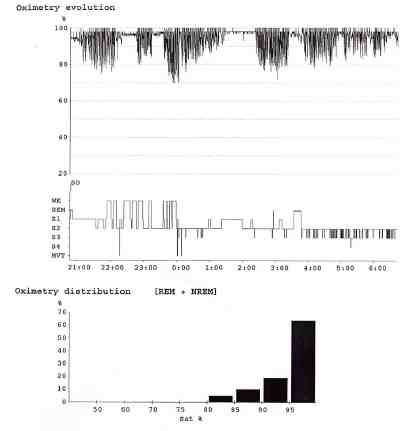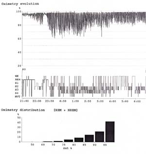 | 手術前 | 手術後 低酸素状態(グラフの一番上)が低下し,無呼吸が改善しています。 (上段の黒い部分が下に行くほど低酸素状態が多かったことを示します。) |