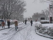 全国的に見舞われたこの冬一番の大寒波の影響で、山口大学のキャンパスも 真っ白に雪化粧。 後期の学期末テスト期間中ということもあり、テスト勉強に励んだ学生達は吹雪にも負けず、 歩きや自転車で登校しました。 1日の山口市の最低気温は零下2.3度。2日は零下3.9度、積雪量は12センチ。 学生達は空いた時間で雪合戦をしたり、雪だるまを作ったり、寒さもそっちのけで山口の冬を満喫しました。