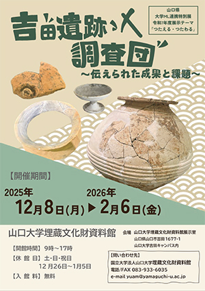 吉田遺跡は、山口盆地を流れる椹野(ふしの)川の左岸に位置する遺跡で、約72万uにおよぶ山口大学吉田キャンパスの範囲にほぼ一致する遺跡です。