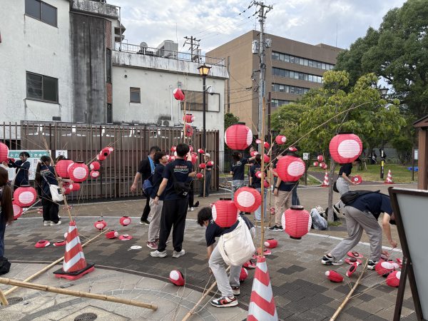 令和7年8月6日(水)、山口市中心商店街周辺にて「山口七夕ちょうちんまつり」の開催に伴い、竹竿ちょうちんの設置・火入れ・撤去に70名の学生ボランティアが参加しました。