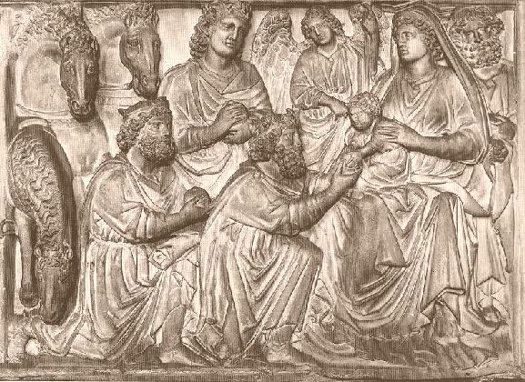 ニコラ・ピサーノ《マギの礼拝》(聖母マリアと幼児キリストの像が、ピサのカンポサントにあるファイドラの石棺の影響を示す)、《説教壇》 1260年 大理石 高さ465 ピサ、洗礼堂
