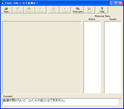 ウインドウを見やすい適当な大きさに調節し、”Open”ボタンを押してゲルイメージを取り込みます。開くことのできる画像ファイル形式は、BMP、JPG、GIFです。イメージを開いてからウインドウの大きさを変更した場合は、”Reset”ボタンを押すと、イメージの大きさが調節されます。