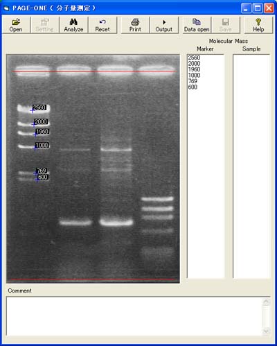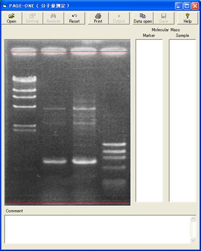 マーカー、目的バンドの移動度とゲルイメージ、”Comment”欄に入力された説明を印刷します。ただしゲルイメージはウインドウの大きさに関係なく一定の大きさで、”Comment”欄の内容は全角30文字で自動的に改行されます。