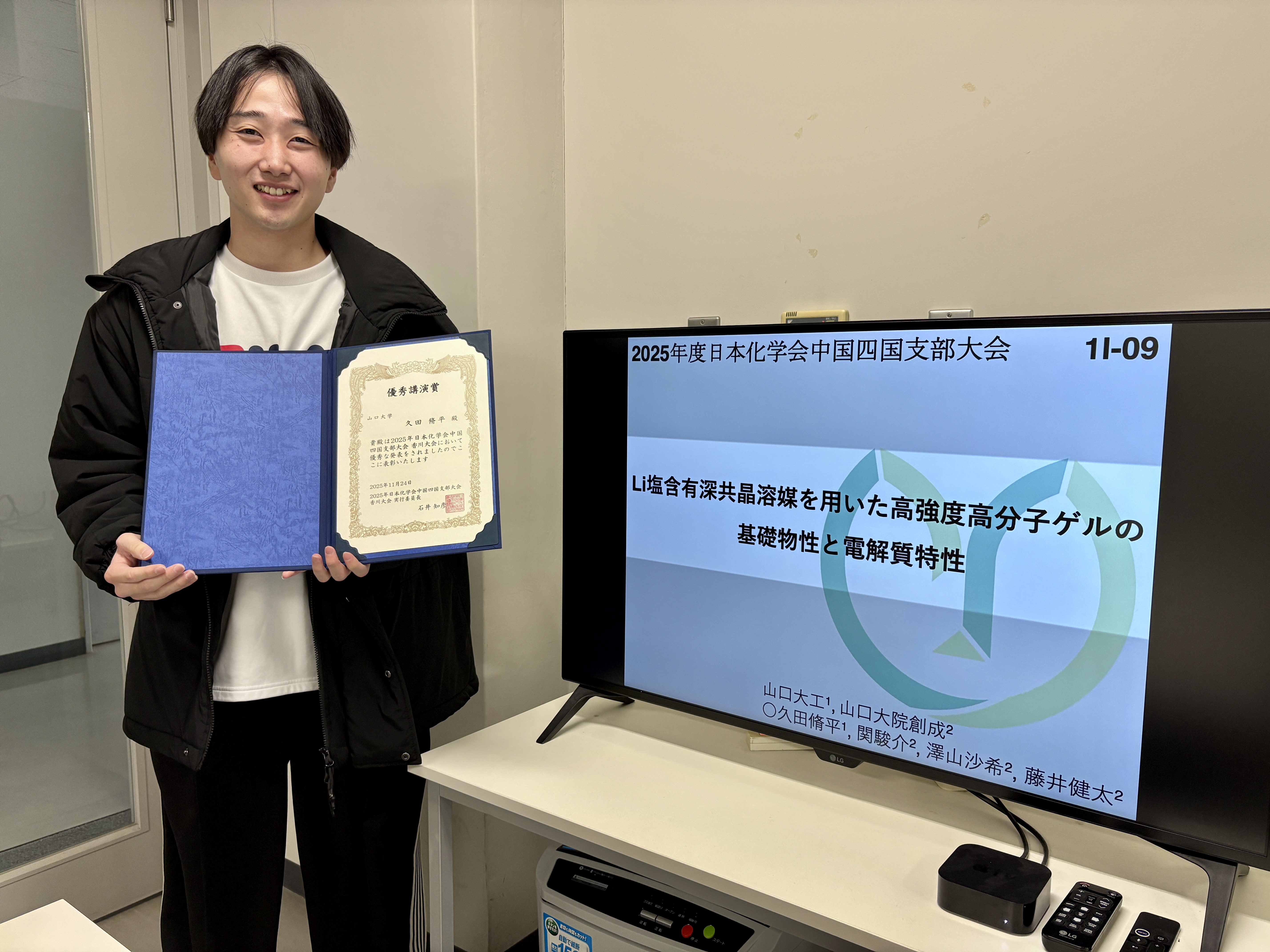 藤井研究室の久田脩平さんが2025年日本化学会中国四国支部大会香川大会において「優秀講演賞」を受賞しました