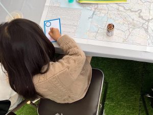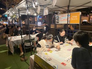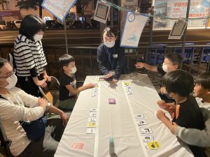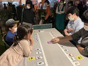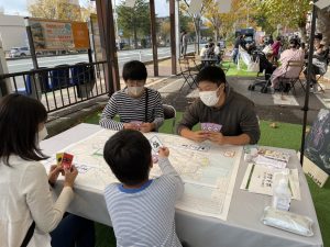 宇部市では、中心市街地の賑わい創出のために、常盤通りの歩道や副道の一部を活用したウォーカブル化に取り組んでおり、「ときわいこっと。2」はその社会実験として実施されました。イベント企画にスタッフとして参加させていただいたことで、普段の研究を実現することの大変さや面白さを知る機会となり、貴重な経験となりました。ポケドボブースには多くの市民の方々が訪れてくださり、カードゲームを通じて、インフラや防災について楽しく学ぶ場を創出できました。