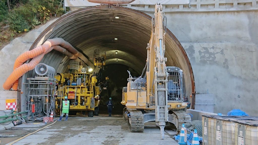 NATM工法が採用された呉トンネルの掘削の様子。坑口近くでは騒音や振動軽減のため機械で掘削されていました。