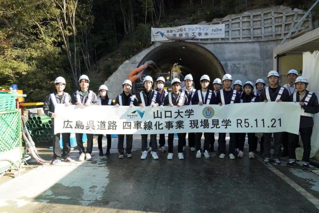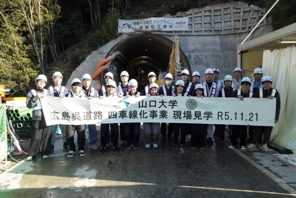 令和5年11月21日、NEXCO西日本のご支援で、地盤工学を専門とする研究室の4年生、大学院生33名が、広島呉道路(クレアライン)の4車線化工事現場を見学しました。見学した現場は、工事で発生した土砂の海上運搬の拠点、呉市福浦地区の切土工事、呉市吉浦地区の呉トンネル工事でした。供用中の道路を通行している安全や周辺住民への配慮が徹底された中で、工事が進められていることを知る機会となりました。