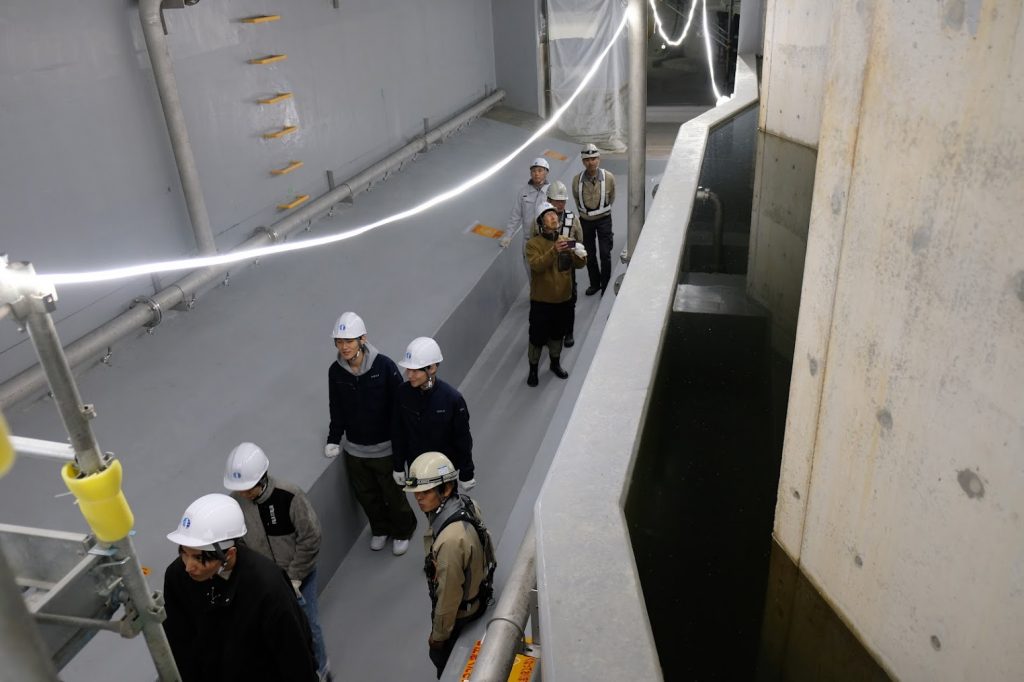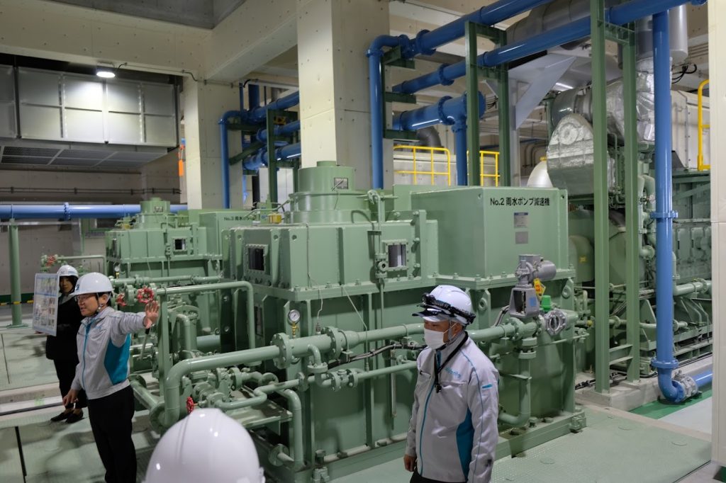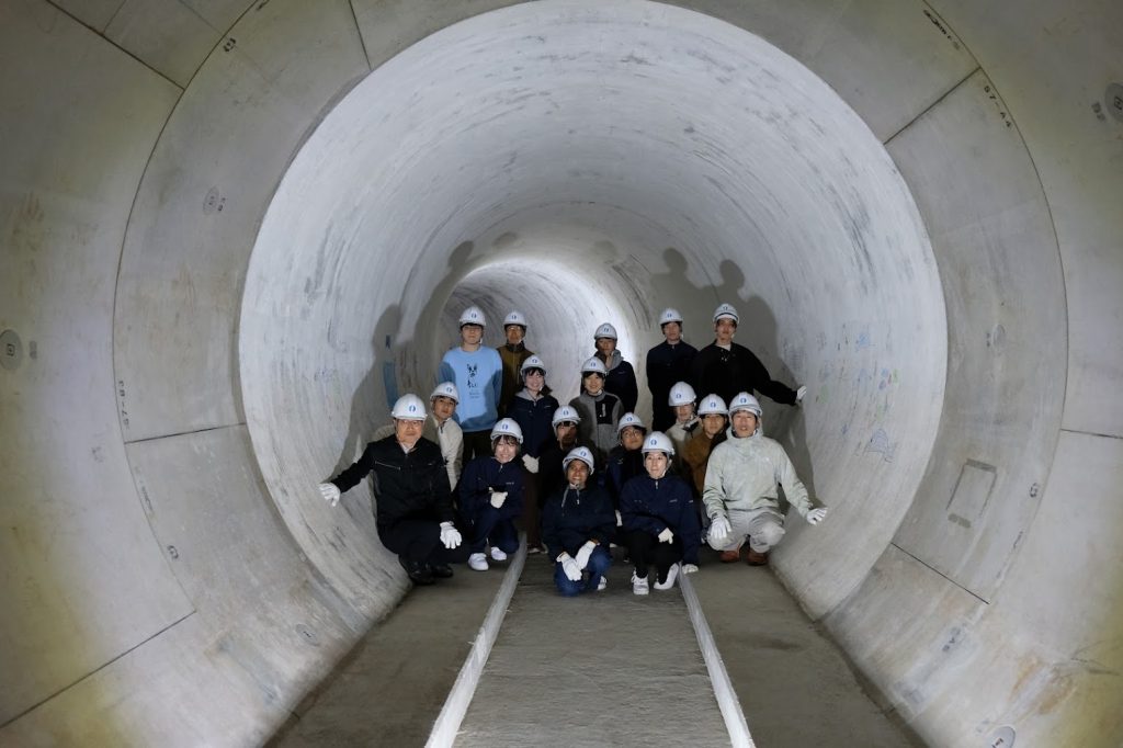 2017年に宇部市が着手した玉川ポンプ場建設工事が終了し,11月13日に完成のお披露目となりました.社会建設工学科からは教職員・学生合わせて19名が見学しました.玉川ポンプ場は下水の合流幹線管渠からの流入水を斜流ポンプでポンプアップし,平常時は西部浄化センターへ汚水を圧送しますが,降雨により流入量が増大すると浄化センターで処理できない排水を雨水放流渠から厚東川に放流します.玉川ポンプ場は環境衛生や防災の上でも市民を守る重要施設であり,2024年3月に完成し、供用を開始します。今回は地下10mのシールド管φ3500mmや玉川ポンプ場施設(機械室や除塵機など)の施設を見学しました.通常は電動機駆動のポンプにより合流管の汚水を浄化センターに圧送しますが,いざ雨水排水となると2100kWの大出力を誇るディーゼルエンジンが斜流ポンプを動かしポンプアップすることになっています.原動機の大音量を吸収するためにポンプ室内は吸音材で覆われています.一度供用が開始されれば二度と入ることのできない排水管の中とあって,一同大変興味深く見学しました.直径4mのシールド機で掘削されてコンクリートのセグメントが複雑なパターンで貼り付けられた3500mmの大口径の管内は先に見学した小学生による落書きで楽しく彩られていました.