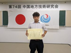 創成科学研究科環境共生系専攻の福丸大智さんが第74回中国地方技術研究会優秀賞を受賞しました
