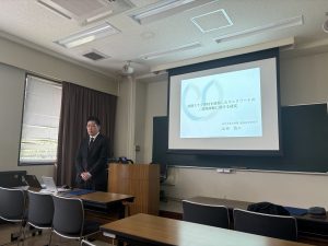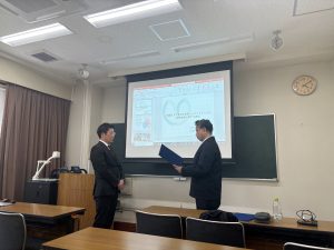 山田悠二講師が「令和5年度日本材料学会中国支部学術奨励賞」を受賞され,岩本剛支部長から賞状を授与されました。受賞題目は「鉄鋼スラグ骨材を使用したコンクリートの破壊挙動に関する研究」で、記念講演が行われました。