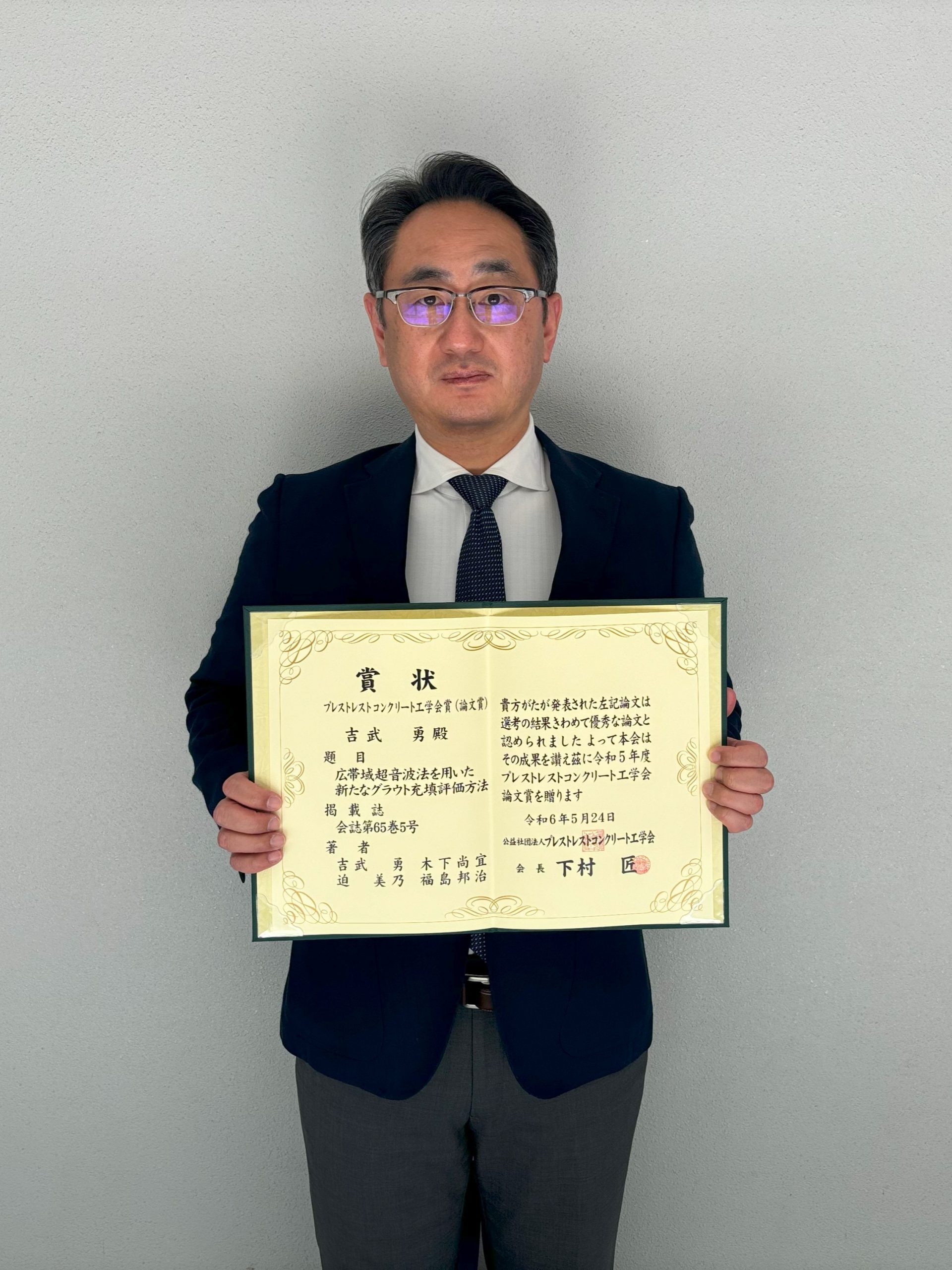 大学院創成科学研究科(工学系)吉武 勇教授が令和5年度プレストレストコンクリート工学会<論文賞>を受賞しました.受賞した論文題目は「広帯域超音波法を用いた新たなグラウト充填評価方法」であり,元山口大学大学院創成科学研究科博士後期課程の木下尚宜氏,同博士前期課程の迫 美乃氏,同博士後期課程の福島邦治氏との共著によるものです.ポストテンション方式プレストレストコンクリート(PC)橋梁では,グラウトの充填不良部から鋼製ケーブルの腐食・破断が生じ,PC橋の耐荷力の低下,さらには落橋にもつながるおそれがあるため,グラウトの充填状態を調べる必要があります.この研究では,グラウトの充填状態を非破壊で調べる広帯域超音波法の推定精度の向上を図ったものであり,コンクリート中を伝播する超音波帯域の弾性波の伝播特性を明らかにしています.この特性を基にグラウト充填状態を評価できる新たな方法を提案し,実際のPC橋において適用性と推定精度を検証されています.この研究成果は,老朽化が進行するPC橋のような社会インフラの維持管理技術として実務でも活用されています.