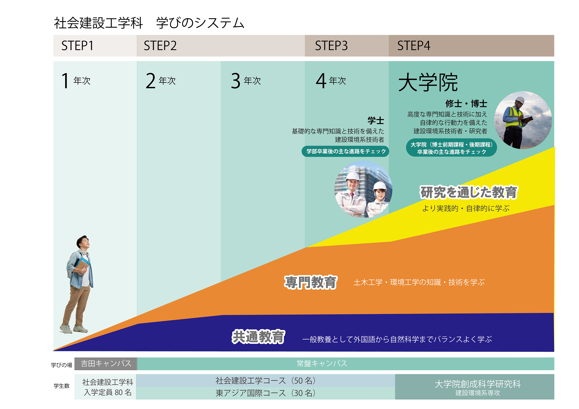 国土・環境デザイン系のカリキュラムは、一般教養を身につけるSTEP1、土木工学と環境工学の基礎を学ぶSTEP2、研究室に配属されて卒業研究に取り組むSTEP3、大学院に進学して専門性を高めるSTEP4、の4段階で構成されます。