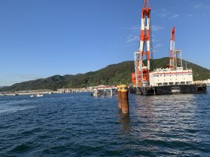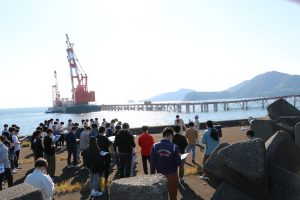 港湾工学の一環としてみなと見学会を10月27日に開催しました.徳山・下松港の下松地区に建設中の桟橋を視察しました.大型のバルク貨物船(コンテナではなく石炭などバラでの積み荷をバルクと呼びます)のための桟橋です.,大型の起重機船でジャケットと呼ばれるプラットフォームを据え付けて,パイルを打ち込みます.非常に迫力のある現場で学生諸君も興味を持って見学していました.この見学会では国土交通省・宇部港湾空港整備事務所および五洋建設の方々のお世話になりました.