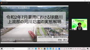 2021年4月19日(月)にWEBにて令和2年7月豪雨災害調査報告会が開催されました(グローカル環境・防災学研究会,地域防災・減災センター共催、後援:土木学会中国支部)。報告会では河川や土砂災害の調査に加えて、避難行動に関する調査など幅広い切り口から報告がなされました。