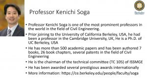 Professor Kenichi Soga of University of California Berkeley, USA will deliver a special lecture entitled ” Smart infrastructure with resilience.” The lecture will be held on 1st November 2021 at 10 am (Japan time). If you are interested, then please join.