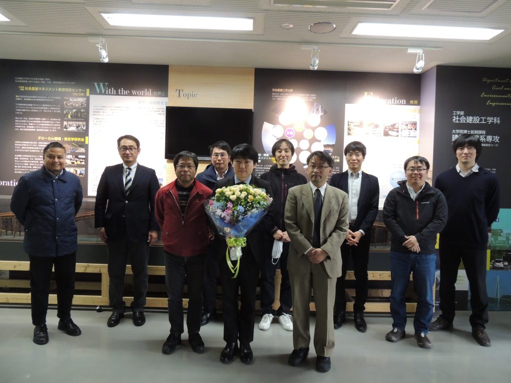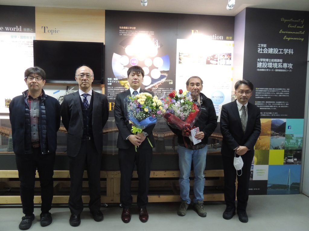 本年度定年を迎えられた山本修三技術職員,3月末で退職される梶山慎太郎助教,白水元助教に花束と餞別の贈呈が行われました.長い間お世話になり,ありがとうございました.
