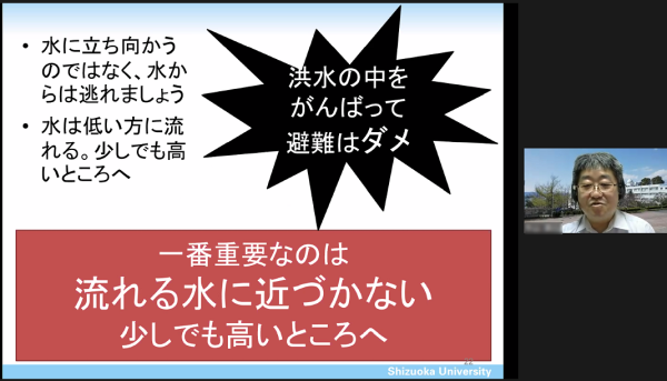 講演会では静岡大学防災総合センター教授の牛山素行氏から、20年以上にわたるデータの解析により風水害の人的被害は主に土砂、洪水により溢れた水、増水した河川への接近が原因であることが具体的な事例とともに紹介されました。また、洪水や土砂災害の犠牲者の多くがハザードマップ等で色付けされた危険箇所で遭難していることから、ハザードマップ等を確認しておくことの重要性が示されました。しかし同時に、ハザードマップで示されていない危険箇所があることも具体的な事例とともに示されました。