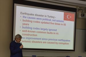 セミナーでは防災学の世界的権威であるユニバーシティカレッジロンドン(UCL)のディヴィッド・アレキサンダー教授に「Managing Today’s Complex Crises: Lessons From the Past」と題してご講演いただきました。今年2月に発生したトルコ・シリア地震の事例などを紹介しながら、将来起こる災害は過去と全く同じということはあり得ないが、複雑化する災害に備え安全な未来に向けてより良い戦略をたてるため、過去の災害の教訓を学び役立てる必要性についてお話されました。将来の災害への備えを考える上での示唆に富んだ非常に有意義なセミナーとなりました。