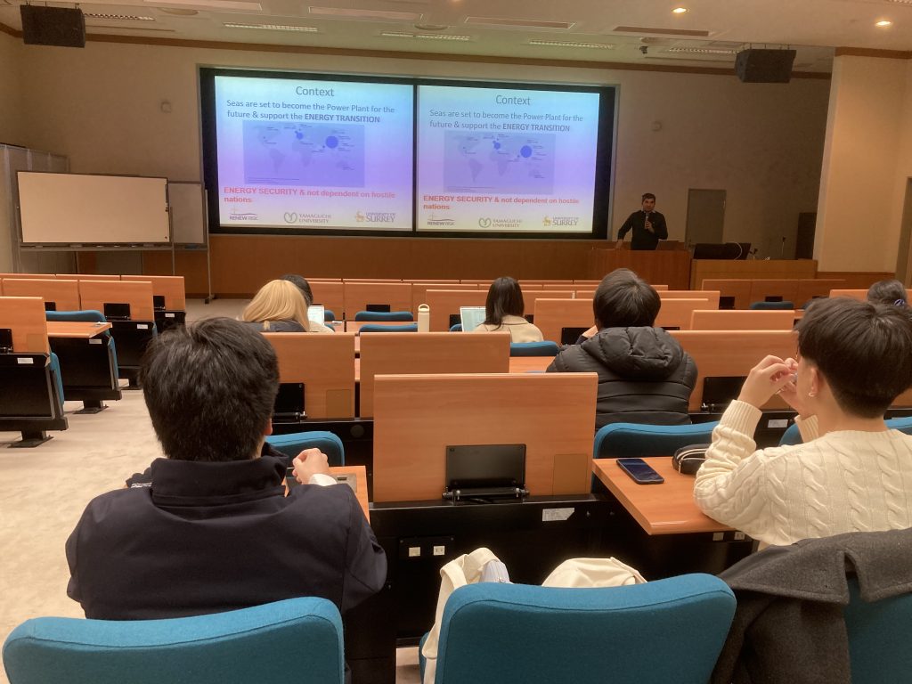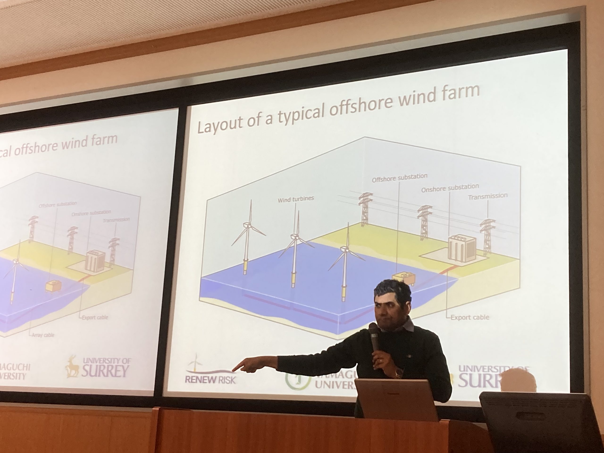 2024年12月26日,サリー大学(イギリス)で地質力学講座を務めるSubhamoy Bhattacharya 教授による国際特別講義「Resilience of Offshore Wind Farms under Extreme Loads」が,山口大学で行われました。特別講義では,風車のグリーンエネルギー生産の過去・現在・未来の傾向について説明がありました。さらに,洋上風力タービンの設計における課題と,それらを克服するための地盤工学に関連する潜在的な解決策についても言及されました。世界の洋上風車研究のパイオニアの一人であるSubhamoy Bhattacharya 教授による研究は参加者の大きな関心を集め,ディスカッションの時間では参加者からの質問やコメントに対して丁寧に回答されました。 社会建設工学科のM. Azizul Moqsud 准教授が,この国際特別講義を企画し,座長を務めました。