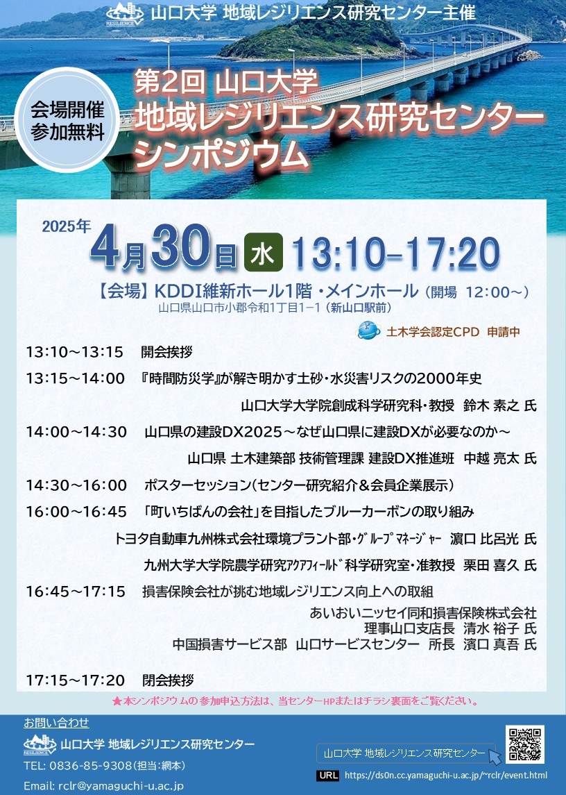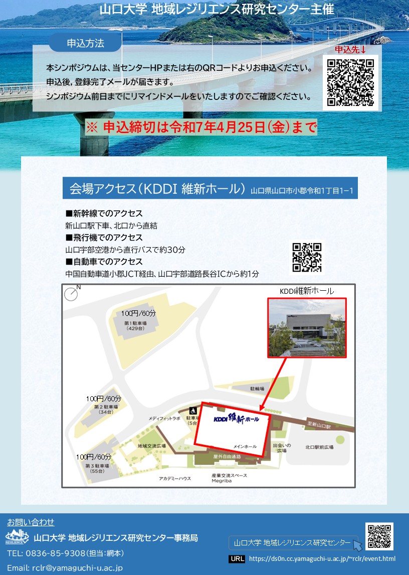 【参加費】無料 【申込方法】 山口大学地域レジリエンス研究センターのホームページから 4月25日(金)までに事前申し込みをお願いいたします。