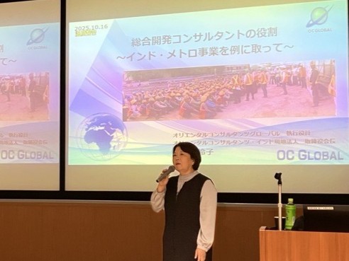 講演会では、本学の工学部建設工学科卒業生で現在株式会社オリエンタルコンサルタンツグローバル執行役員・インド現地法人取締役会長の阿部玲子氏が「海外建設プロジェクトの現状~インド・メトロ事業を例に取って~」と題して講演しました。