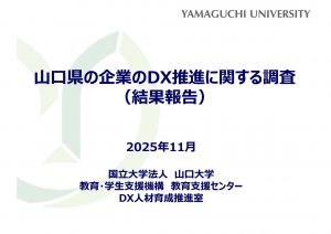 「山口県の企業のDX推進に関する調査」を実施しました。 HOME > 新着情報 > 「山口県の企業のDX推進に関する調査」を実施しました。 「山口県の企業のDX推進に関する調査」を実施しました。 山口大学ではこの度、山口県に主要な拠点を有する企業を対象に「山口県の企業のDX推進に関する調査」を実施しました。 今般、調査結果を取りまとめましたので当サイトに掲載します。DX推進の参考としていただければ幸いです。 報告内容に関するご質問、ご意見等は、掲載資料の末尾に記載のお問合せ先までお気軽にご連絡ください。 山口県の企業のDX推進に関するアンケート調査結果_