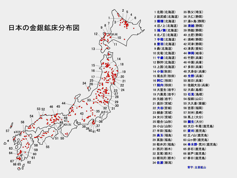 日本国内で稼業された金銀鉱山は付図(分布図)のように広く全国にわたり、盛んに採掘されてきたが、現在稼業しているのは鹿児島県菱刈鉱山だけとなった。 この分布図から、かつてマルコポーロが「東方見聞録(1298年)」で日本を「黄金の国ジパング」といったことも頷ける。 日本で初めて金が発見されたのは、聖武天皇の時代、天平21年(西暦749年)、陸奥国小田郡(現 宮城県涌谷町黄金迫)で、陸奥国守百済王敬福、朱牟須賣(スムスメ)、冶金師戸淨山らの百済の帰化人によって砂金として見い出され、黄金(砂金)600両(約13 kg)が献上された。 時は奈良東大寺盧舎那仏(大仏)造立中で、天皇は大いに喜び、年号を天平感宝と改め、金発見者には叙位を与え、小田郡の民は3年間租税を免ぜられた。 この地には、現在も黄金山神社、黄金橋、金洗井などの遺跡がある。 黄金迫の沢は沖積土に被われ、その底に砂岩、粘板岩、花崗閃緑岩などの礫層があり、その中に含金石英礫を含み、これが風化分解して砂金になったものと考えられる。 この地方は北上山地が南端で仙台平野に接する丘陵地帯にあたり、地形が韓国南部の砂金地帯によく似ていたと言う。