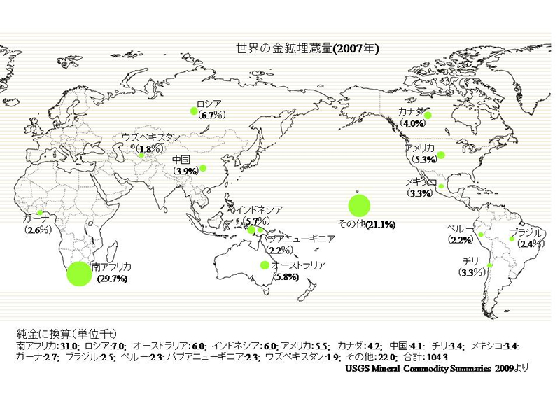 世界における金および銀鉱石の生産量と埋蔵量(2007年)が下図に示されている。