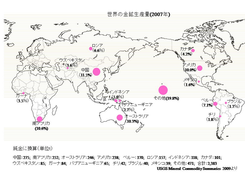 金の生産量は中国、南アフリカ、オーストラリア、アメリカ、ペルーなどで、埋蔵量も南アフリカ、ロシア、オーストラリア、インドネシア、アメリカなどで、インドネシアを除き、大陸の諸国が主要産地で共に世界の60%以上を占めている。
