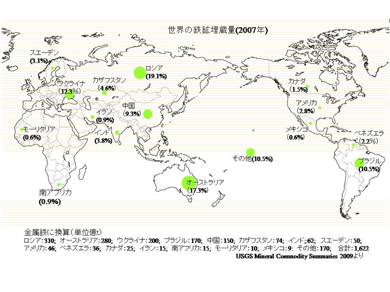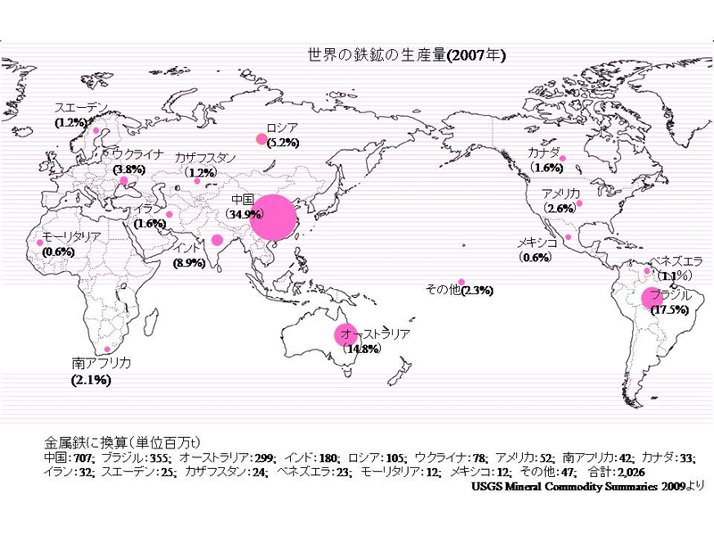 各国より輸入した鉱石は製鉄所で製錬されている。その粗鉱量は年間計1億4千トン、生産額は世界第2位(2007年度)である。各国の鉄の埋蔵量と生産量は下図のようである。