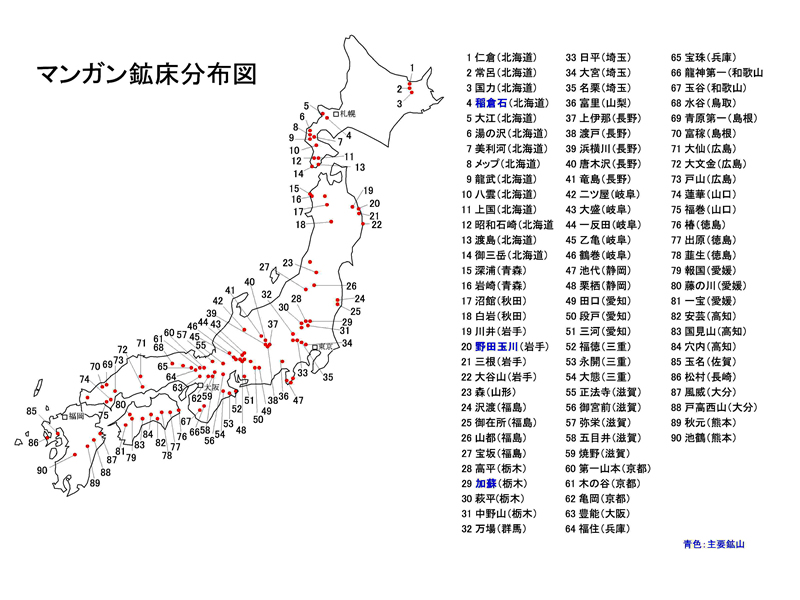 マンガンは、鋼(はがね)の強度や硬度など諸性質の向上に欠くことのできない重要な金属で、粗鋼生産の際、マンガンの中間製品であるフェロマンガン(高炭素および中・低炭素)やシリコマンガンの形で、脱酸・脱硫剤として必ず添加される。マンガンの最大の用途はこれであり、20数年前までは野田玉川(岩手)、大江、上岡、稲倉石、石崎(以上北海道)、加蘇(栃木)、浜横川(長野)などをはじめ、中小多数の鉱山が全国的に存在し、マンガン鉱を出荷していた(下図)。