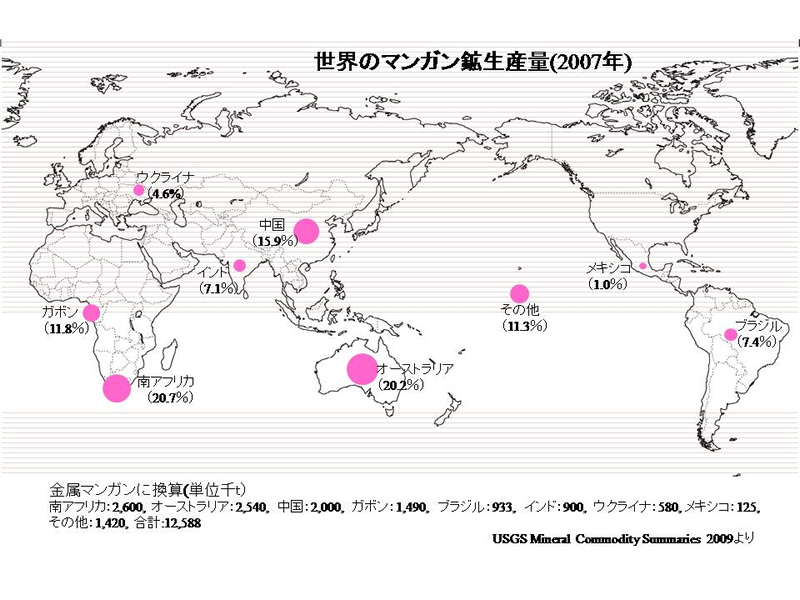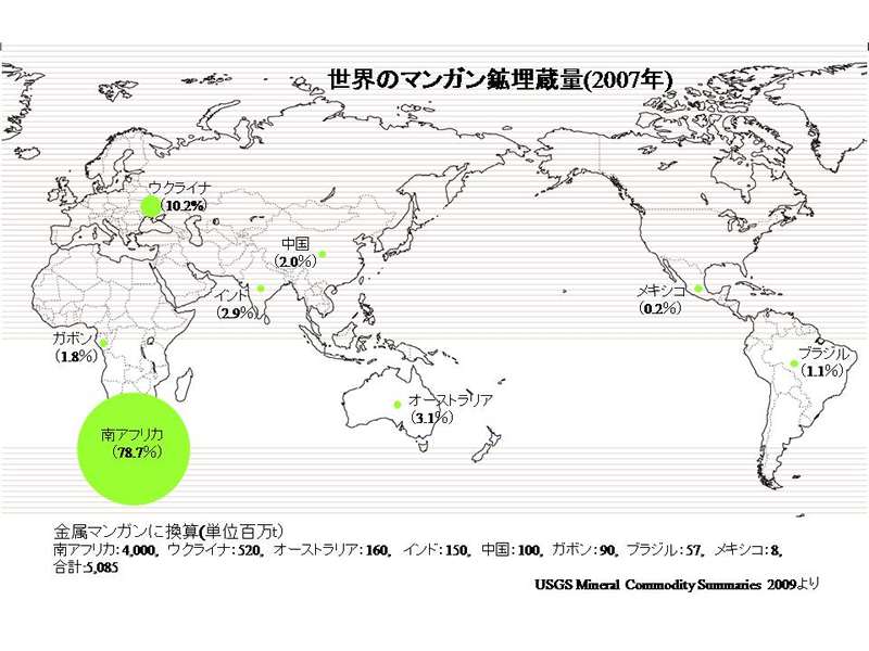 世界のマンガン鉱の生産量と埋蔵量は下図のようである。