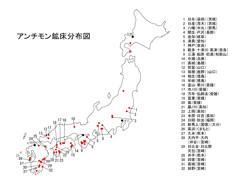 アンチモンの鉱石鉱物は下表のようである。そのうち、アンチモンの原鉱として用いられているのはほとんど輝安鉱Sb2S3 である。この鉱物は鉛灰色の柱状の美しい結晶で、長さ数cm~10cm、稀には20~30cm 大のものもあり、石英の晶洞中に産する。中でも愛媛県市ノ川鉱山産のものは世界的に有名である。ベルチェ鉱FeSb2S4 は中瀬(兵庫)、戸沢(長野)からの輝安鉱と共に産出し、これもアンチモンの原鉱として用いられる。安四面銅鉱(Cu,Fe,Zn)12Sb4S13、濃紅銀鉱Ag2SbS3、毛鉱Pb4FeSb5S14 などのアンチモン硫塩鉱物も銀、銅、鉛などの製錬の際、副産物の金属アンチモンや鉛・アンチモン合金として回収される。