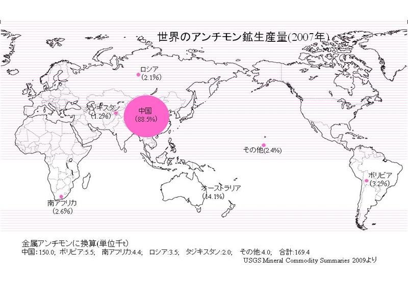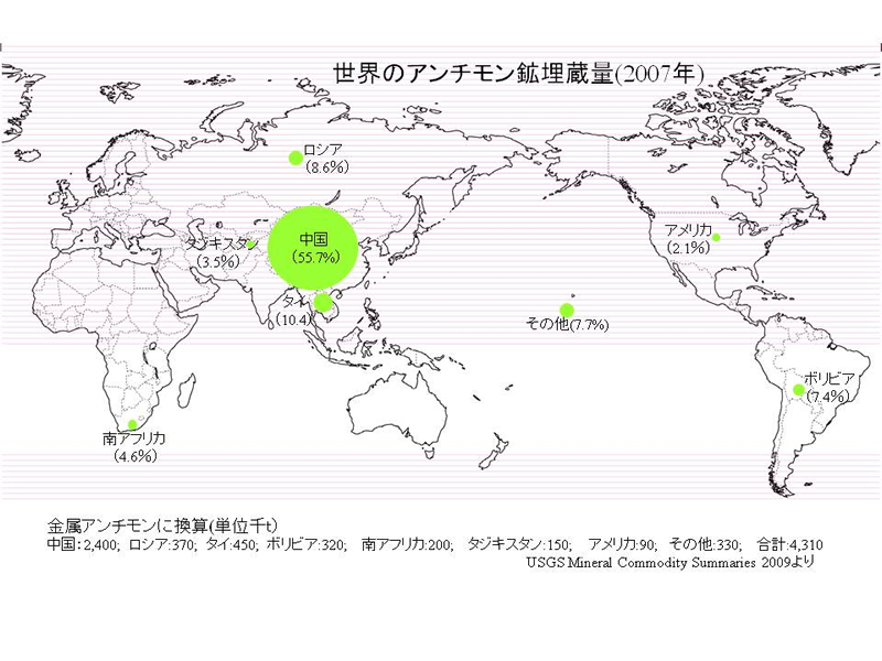 2007年における世界の国別アンチモン鉱の生産量および埋蔵量が図に示されている。中国が生産量(世界の88.5%)、埋蔵量(55.7%)ともに断トツの1位である。その他にわずかではあるが、ボリビア、南アフリカ、ロシア、タジキスタンなどで生産されている。また、埋蔵量ではタイ、ロシア、ボリビア、南アフリカ、タジキスタン、アメリカなどが続くが、中国の動向によっては、タングステン同様、アンチモンの国際市況も大きく影響される可能性が大きい。