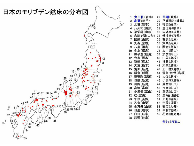 戦時中、軍需省(現経済産業省)はレーダー(電波探知機)などの電子機器(兵器)の改良と増産のため、国内のモリブデン資源の開発を進め、大小多数のモリブデン鉱山が稼働した。終戦後その多くは廃山となったが、平瀬(岐阜)、小馬木、東山、大東(島根)など数鉱山は1980年~1990年頃まで採掘し、その後休山となった。