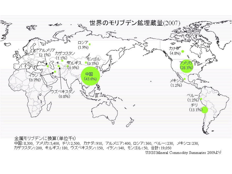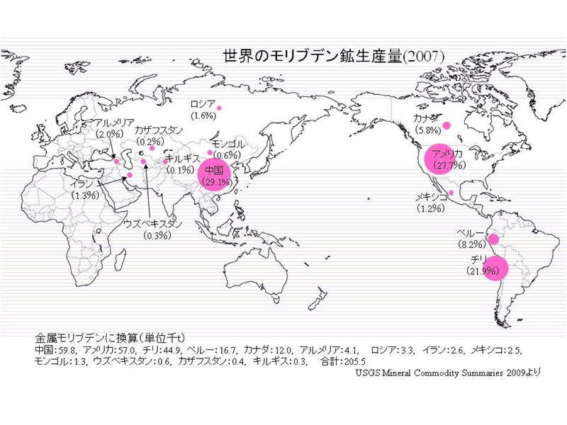 モリブデンの鉱石鉱物は付表のようであるが、実際はほとんど輝水鉛鉱MoS2だけである。その多くは黄銅鉱や石英に伴って産する。南北アメリカ大陸のコルディレラ山系中チリ、アメリカ、メキシコ、カナダに見られる斑岩銅鉱床からの産出が世界的に最も多い(付図世界の生産量参照)。