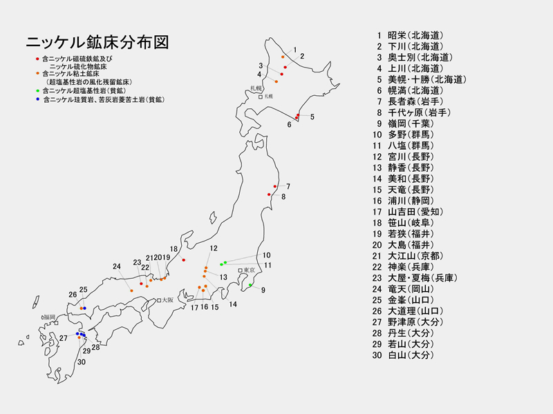 現在,日本にはニッケルを産する鉱山は皆無である。 鉱床分布図に示したものの多くは戦時中軍需のため採算を度外視して採掘した鉱山である。 北海道の幌満からはペントランド鉱,ポリジム鉱,含ニッケル磁硫鉄鉱,十勝からはペントランド鉱,長野県天竜からはペントランド鉱,黄鉄ニッケル鉱,含ニッケル磁硫鉄鉱,黄銅鉱,兵庫県大屋(夏梅)からは硫砒ニッケル鉱,紅砒ニッケル鉱,針ニッケル鉱などを産した。 いずれも小規模の鉱体である。
