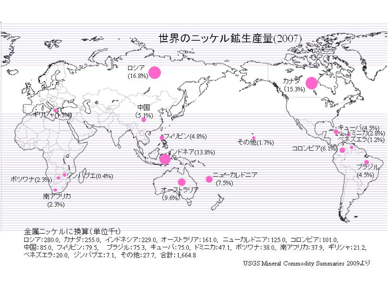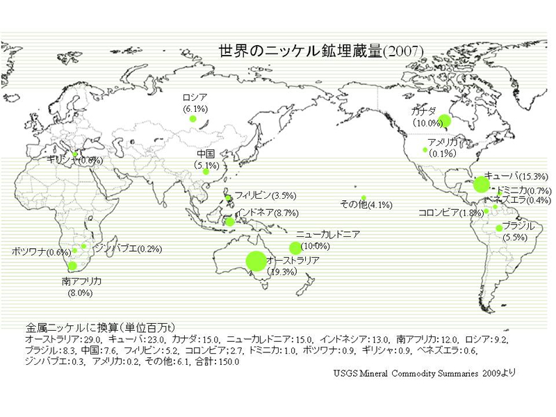 2007年における世界のニッケル鉱の生産量や埋蔵量が図に示されている。オーストラリア,ロシア(シベリア),カナダ,インド,キューバ,ニューカレドニアなどの国々に偏在する金属資源であることが分かる。