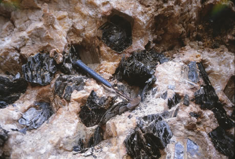この残液は温度が下がっても水などの濃集のため,蒸気圧はかなり高くなる。もし周囲の岩石中に,この圧力に耐えない部分があれば,そこを破壊して揮発分が外部に放散される。しかし,深い地中で外圧が十分であれば,揮発成分は残液中に保存され,残液の主成分である珪酸(SiO2),アルカリ(K2O,Na2O),アルミナ(Al2O3)などとともに濃集し,著しく水分や揮発成分に富んだマグマ(残液)ができる。この残留マグマは水の増加により粘性が小さくなって,動き易く,しかも高い蒸気圧で,貫入力強く,溶解力も大きい。単に割れ目に岩脈として侵入するだけでなく,その源となった花こう岩などと反応し,その一部を円筒状,漏斗(ロート)状に交代した岩石となるが,これがペグマタイト鉱床である。このペグマタイトの大規模のものが鉱山として採掘されている。
