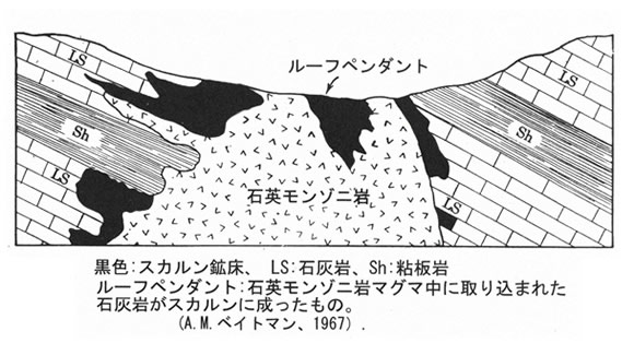 これはまた花こう岩との接触部付近で炭酸岩塩を交代して産することから,かつては接触交代鉱床と称された。しかし,必ずしも上記の接触部に鉱床ができるとは限らず,それより離れた石灰岩中に生じる方が多いことがわかり,今ではスカルン鉱床という言い方が一般的である。スカルン鉱床の模式的形態は右図のようである。