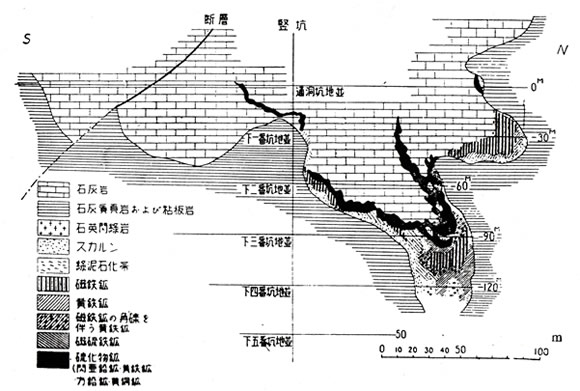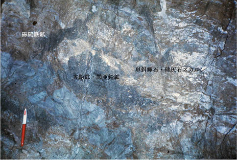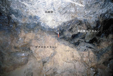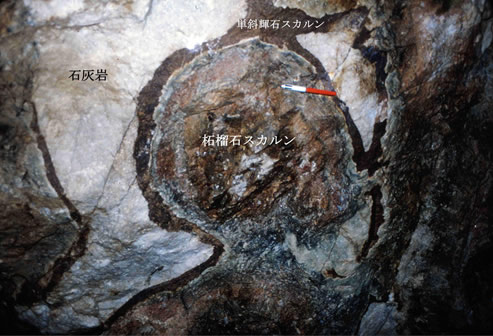 一般に,スカルン鉱物は石灰岩-珪灰石-単斜輝石-ザクロ石と累帯配列することが多く,銅,鉛・亜鉛鉱石は単斜輝石スカルン中に,鉄鉱石(磁鉄鉱)はザクロ石スカルン中に濃集する傾向がある。