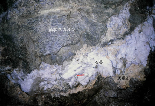 また,タングステン鉱石(灰重石)はスカルン生成後の鉱化作用により,石英を随伴して脈状を呈して産する事が多い。