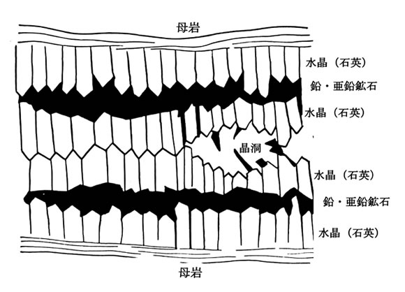 熱水から晶出する鉱物は,割れ目の両側(外側)から順次右図のように内側へ向って沈殿する。